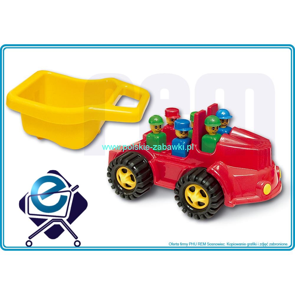Samochód „Jeep” ma długość 36 cm. Wyróżnia się agresywnym kształtem, a jego masywne koła pozwolą pokonać niejedną przeszkodę. Posiada zdejmowaną skrzynię ładunkową, pod którą znajduje się platforma do układania klocków K2, dostępnych w ofercie firmy Hemar. W kabinie mamy aż 2 kierowców, a na tzw. „pace” 4 pasażerów.