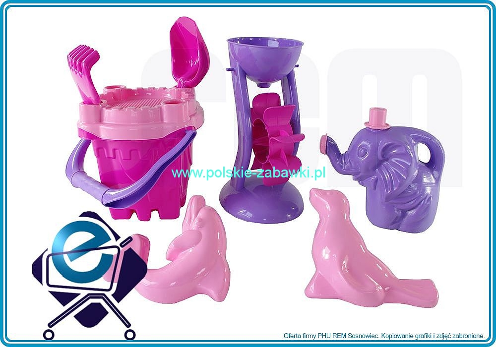 | W zestawie: - duże wiaderko "zamek" - 1 szt. - sitko - 1 szt. - łopatka - 1 szt. - grabki - 1 szt. - młynek do piasku - 1 szt. - konewka 'słoń' - 1 szt. - foremkia delfin - 1 szt. - foremkia foka - 1 szt. |